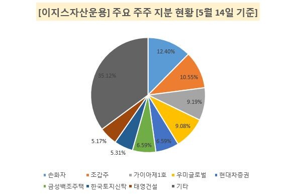 지난 14일 기준 손 씨의 지분율은 3월 말 22.2%에서 12.4%로 9.8% 떨어졌다. 손 씨에 이어 2대주주는 조갑주 이지스자산운용 대표로 지분 10.55%를 보유하고 있다. 최대주주와 1.85%밖에 차이가 나지 않는다.