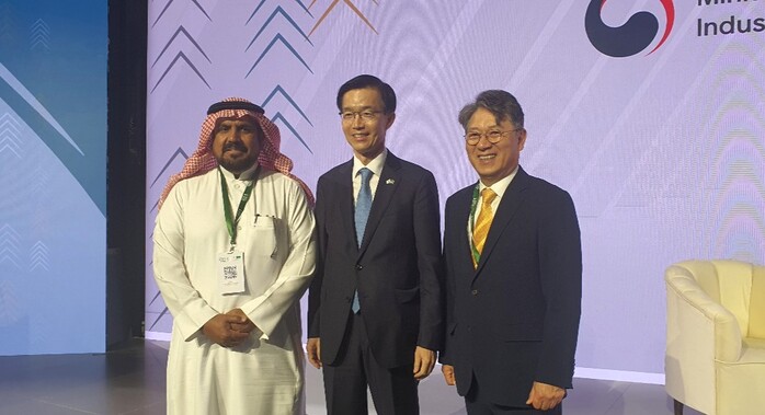 ▲사진 오른쪽부터 KG 모빌리티 곽재선 회장, 산업통상자원부 방문규 장관, SNAM사 파드 알도히시(Dr. Fahd S Aldohish) 대표이사. [사진=KG 모빌리티] |