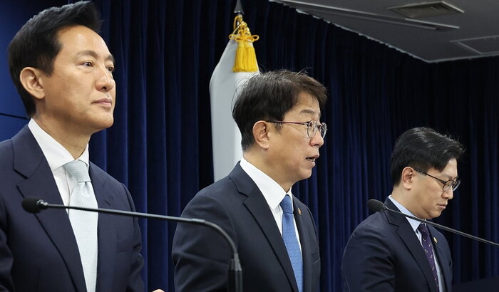 | ▲ 박상우 국토교통부 장관(가운데)이 19일 서울 종로구 정부서울청사에서 오세훈 서울시장 등과 주택시장 안정화 방안 발표를 하고 있다. [사진=연합뉴스] |