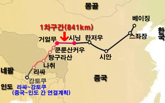칭하이성 시닝과 몽골·티베트족 자치주 거얼무 간 해발 2,000~3,000m의 고도에 814km의 1차 구간 공사가 1979년 완공되어 시험 운행을 거쳐 1984년부터 운행이 개시되었으나 엄청난 적자 등으로 2차 공사를 미룬 후 2000년 11월 장쩌민(江澤民) 주석 특별 지시로 2001년 6월 29일 장장 17년 만에 2차 공사 착공식이 거얼무와 라싸에서 동시에 열렸다.