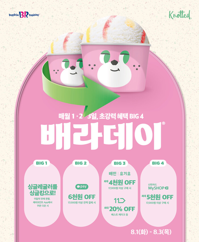 배스킨라빈스 관계자는 “프리미엄 디저트 카페 노티드와 협업한 8월 이달의 맛 ‘아이스 노티드 우유 생크림’을 가장 먼저, 가장 큰 혜택으로 만나볼 수 있도록 ‘배라데이’를 준비했다”며 “배스킨라빈스 아이스크림과 함께 시원하게 8월을 시작하시길 바란다”고 전했다.