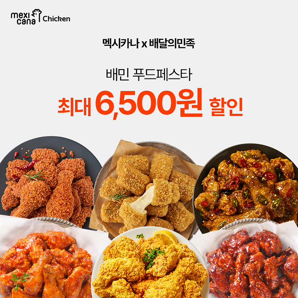 [메가경제=양대선 기자] 치킨 전문 프랜차이즈 멕시카나가 배달의민족 ‘푸드페스타’를 통하여 멕시카나치킨의 모든 제품 주문 시 선착순으로 최대 6500원 할인 혜택을 제공한다고 1일 밝혔다.