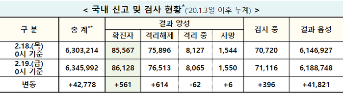중앙방역대책본부(방대본)는 19일 0시 기준으로 전날 대비 코로나19 신규 확진자가 561명 발생해 지금까지 누적 확진자는 8만6128명(해외유입 6837명)으로 집계됐다고 밝혔다.