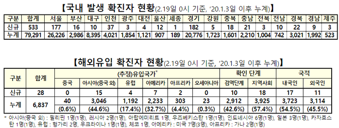 ▲ 19일 0시 기준 전날 대비 코로나19 국내발생(지역뱔생) 및 해외유입 확진자 현황. [출처= 중앙방역대책본부] |