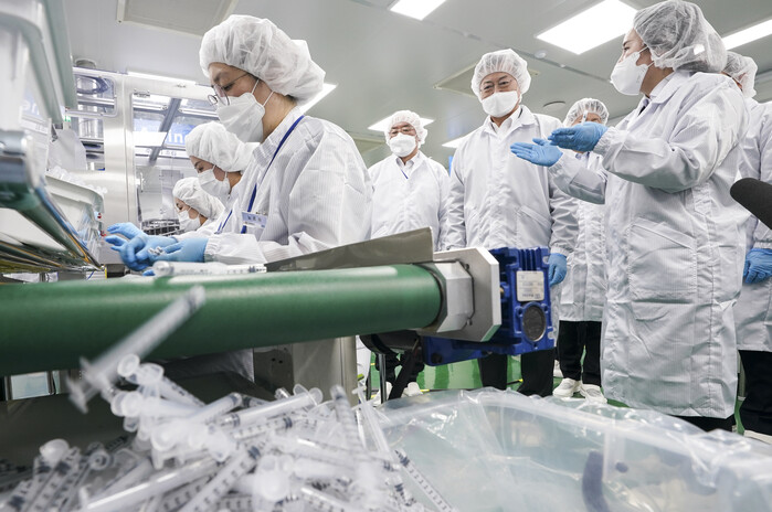 ▲ 문재인 대통령이 18일 오후 전북 군산시 코로나19 백신접종용 최소잔여형(LDS) 주사기 생산시설인 풍림파마텍에서 주사기 생산라인을 시찰하고 있다. [군산= 연합뉴스] |