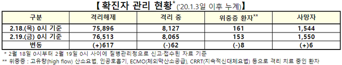 ▲ 19일 0시 기준 전날 대비 코로나19 확진자 관리 현황. [출처= 중앙방역대책본부] |
