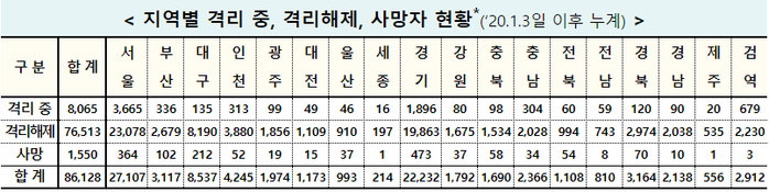 ▲ 19일 0시 기준 전날 대비 코로나19 지역별 격리 및 사망자 현황. [출처= 중앙방역대책본부] |