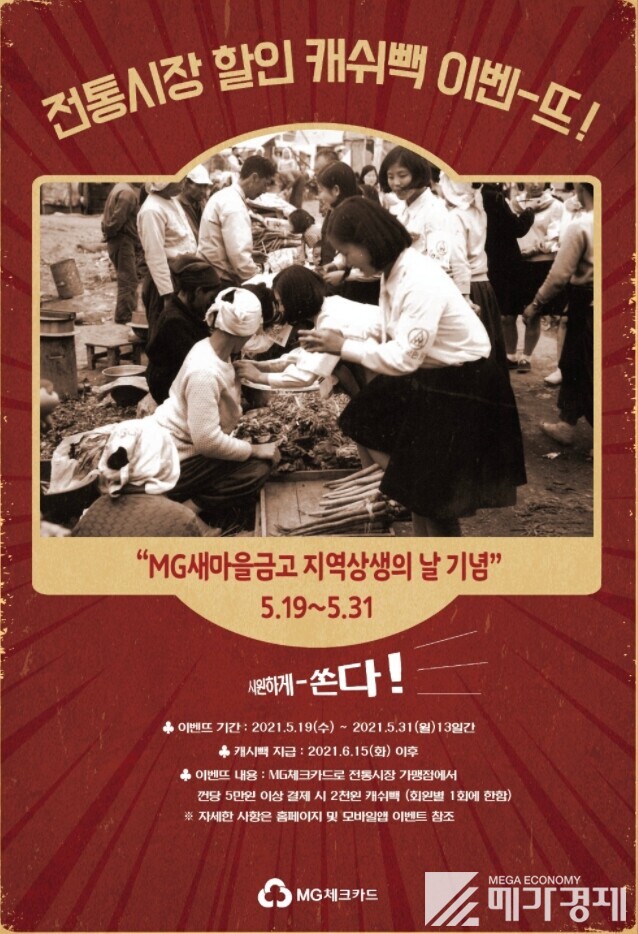 MG새마을금고(중앙회장 박차훈)는 MG새마을금고 지역상생의 날을 기념해 MG체크카드를 이용하는 회원들과 희망의 마음을 나누고자 5월 19일부터 5월 31일까지 약 13일간 전통시장 할인 캐시백 이벤트를 진행한다.
