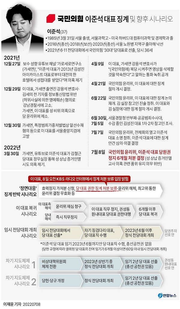 | ▲ 국민의힘 이준석 대표 징계 및 향후 시나리오. [그래픽=연합뉴스] |