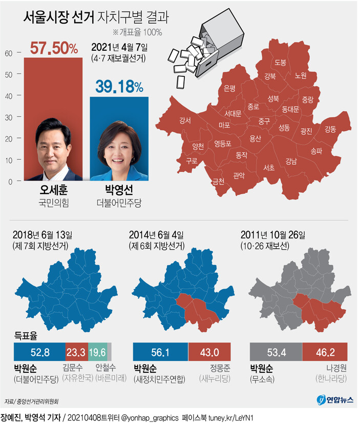 ▲ 서울시장 선거 자치구별 결과. [그래픽= 연합뉴스] |