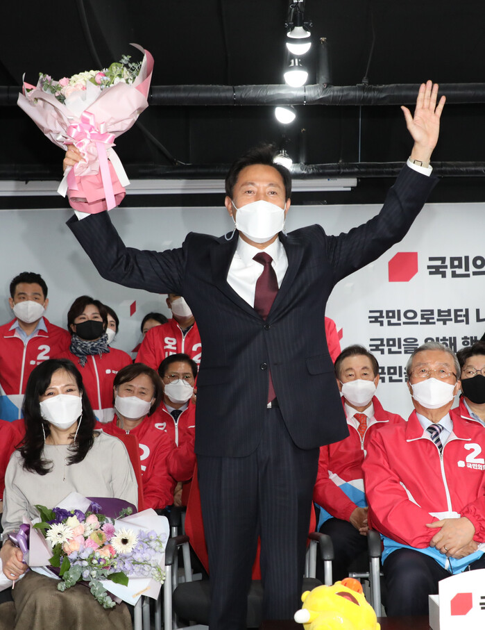 ▲ 국민의힘 오세훈 후보가 4ㆍ7 재보궐 선거에서 서울시장 당선이 확실해지자 8일 자정께 서울 여의도 당사 개표상황실에서 꽃다발을 받고 기뻐하고 있다. [서울= 연합뉴스] |