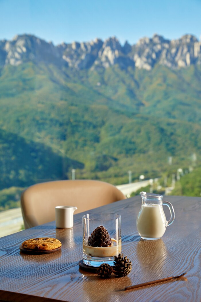 탁 트인 울산바위 전망을 자랑하는 대명소노그룹의 강원도 고성 소노펠리체 델피노의 ‘더 엠브로시아’에서는 솔방울 모양 에스프레소를 넣은 솔방울 라떼와 마카다미아 더블초코칩 쿠키를 세트로 판매한다.