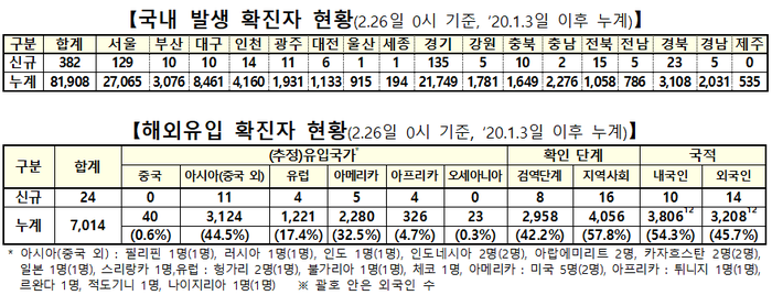 ▲ 26일 0시 기준 코로나19 국내발생 및 해외유입 확진자 현황. [출처= 중앙방역대책본부] |