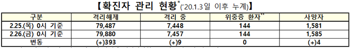 ▲ 26일 0시 기준 코로나19 확진자 관린 현황. [출처= 중앙방역대책본부] |