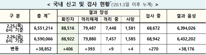 ▲ 26일 0시 기준 코로나19 국내 신고 및 검사 현황. [출처= 중앙방역대책본부] |