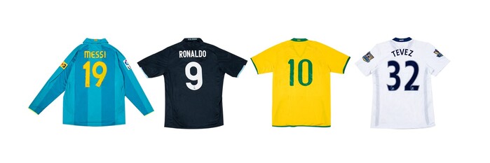 | ▲ 이랜드뮤지엄 기증 소장품. 왼쪽부터 리오넬 메시, 크리스티아누 호날두, 카카, 카를로스 테베즈가 실제 착용한 FC바르셀로나, 레알마드리드, 브라질 국가대표, 맨체스터 유나이티드 유니폼. [사진=이랜드그룹 제공] |