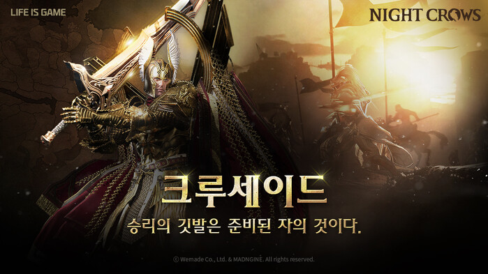 [메가경제=이동훈 기자] 위메이드(대표 박관호)가 서비스하고 매드엔진(공동대표 손면석, 이정욱)에서 개발한 대작 MMORPG <나이트 크로우>가 오늘(18일) 대규모 전쟁 ‘크루세이드’ 소개 영상을 선보였다. 이번 소개 영상에서는 크루세이드 참여 일정과 영지 종류 등 25일(목) 새롭게 추가되는 콘텐츠에 대한 설명을 담았다.