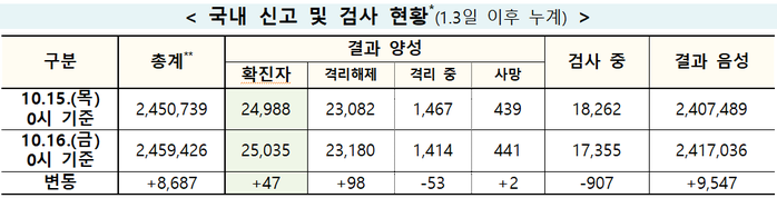 누적확진 2만5035명·사망자 총 441명...어제 8687건 검사, 양성률 0.54%