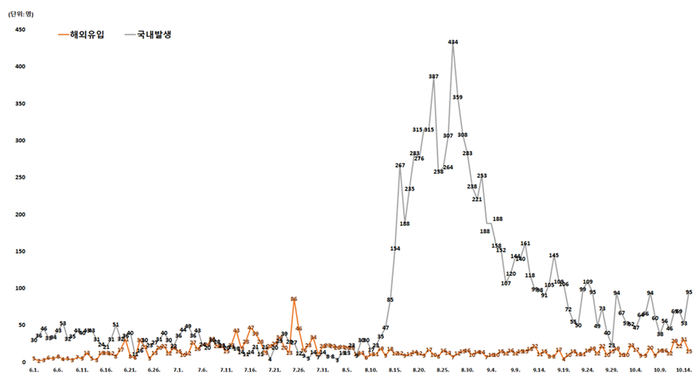 ▲ 지난 15일 0시 기준 국내발생과 해외유입 신규 확진자 추이. [출처= 중앙방역대책본부] |