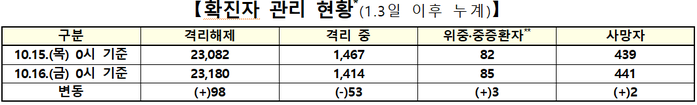 ▲ 16일 0시 기준 코로나19 확진자 관리 현황. [출처= 중앙방역대책본부] |