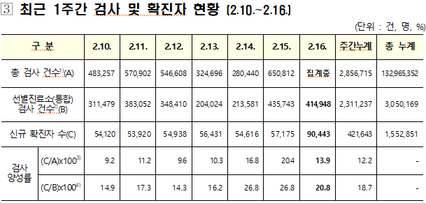 중앙방역대책본부(방대본)는 16일 0시 기준으로 코로나19 신규 확진자가 9만443명이나 발생했다고 밝혔다. 이로써 누적 확진자수는 155만2851명(해외유입 2만7569명)으로 150만명을 넘어섰다.