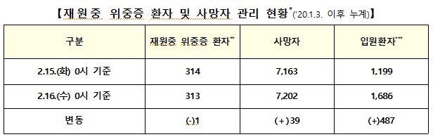 이날 0시 기준으로 위중증 환자는 전날보다 1명이 적은 313명으로 집계됐다. 다만 위중증 환자수는 감소세를 유지하다가 2월 2주째부터 증가세로 전환, 향후 추세가 주목된다.