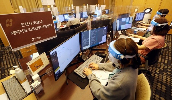 ▲ 정부가 코로나19 새 재택치료 체계를 가동한 지난 10일 오전 인천시 서구 나은병원 코로나19 재택치료 상담센터에서 의료진 등이 분주하게 상담을 진행하고 있다. [인천=연합뉴스] |