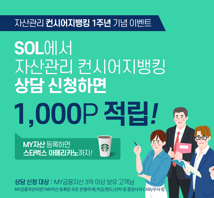 이번 이벤트는 고객이 신한 쏠(SOL)에서 주식, 개인형IRP 등 타 기관 금융자산을 모두 포함할 수 있는 마이자산(오픈뱅킹)을 등록하고 ‘자산관리 컨시어지뱅킹’ 서비스를 신청하면 마이신한포인트 1,000P와 스타벅스 아메리카노 쿠폰을 제공한다.