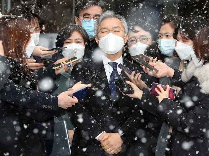 ▲ 최강욱 열린민주당 대표가 28일 오전 서울 서초구 서울중앙지법에서 열린 1심 선고공판에 출석한 뒤 법정을 나서며 취재진 질문에 답하고 있다. [사진= 연합뉴스] |