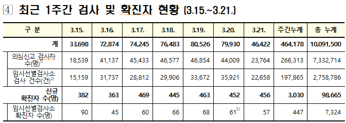 ▲ 코로나19 21일 0시 기준 최근 1주간 검사 및 확진자 현황. [출처= 중앙방역대책본부] |