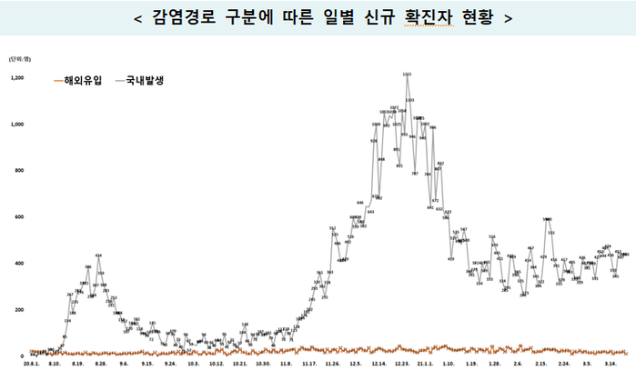 전체 신규 확진자를 감염경로별로 보면 전국 곳곳의 지역사회에서 나온 국내발생(지역발생)은 437명, 해외유입은 19명이다. 전날보다 지역발생은 3명이 적으나 해외유입은 7명이 많다.