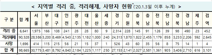 ▲ 코로나19 21일 0시 기준 지역별 격리 및 사망자 현황. [출처= 중앙방역대책본부] |