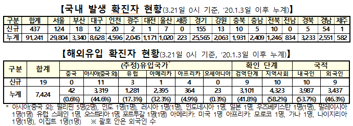 지역발생 확진자와 지역사회에서 자가격리중 양성판정을 받은 해외유입 확진자를 합치면 서울 125명, 경기 157명, 인천 22명 등 수도권이 304명으로 국내 신규 확진자 456명 중 66.7%를 차지했다.