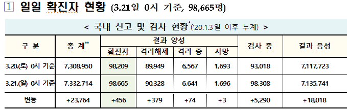 중앙방역대책본부(방대본)는 21일 0시 기준으로 국내 코로나19 신규 확진자가 456명 추가 발생해 지금까지 누적 확진자가 9만8665명(해외유입 7424명)으로 집계됐다고 밝혔다.
