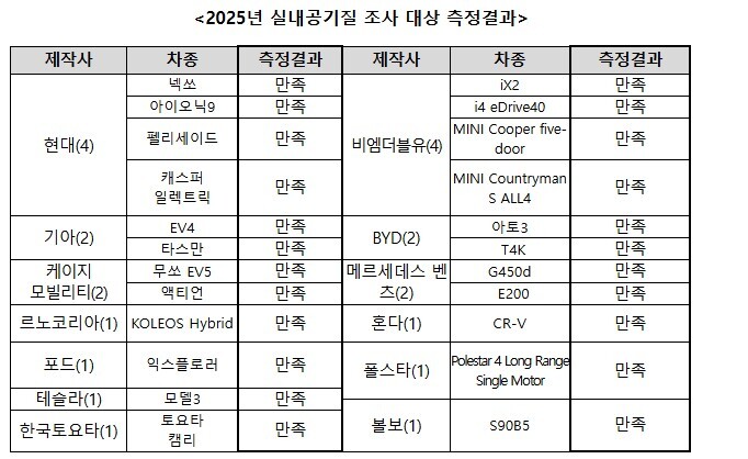 국토교통부는 15일 2025년 신차 실내공기질 조사 결과를 발표하고, 현대자동차·기아·BMW·메르세데스-벤츠·테슬라·토요타 등 13개 제작사의 23개 차종이 8종의 휘발성 유해물질 권고기준을 모두 충족했다고 밝혔다.