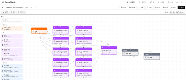 어센드매트릭스의 대표 기능 중 하나는 AI 배너 자동생성이다. 광고주의 제품 이미지와 핵심 소구 포인트를 입력하면 다양한 매체 규격에 맞는 배너 소재가 자동으로 생성되며, A/B 테스트용 변형 소재까지 대량으로 제작할 수 있다. 기존에는 디자이너가 수일에 걸쳐 작업하던 과정을 수 시간 내로 단축함으로써, 마케터는 소재 제작에 소모되던 시간을 캠페인 전략 수립과 데이터 분석에 재투입할 수 있게 됐다.