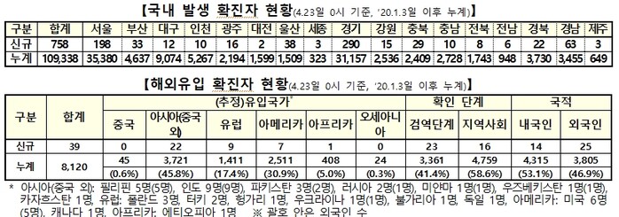신규 확진자 중 전국 곳곳에서 발생한 국내발생(지역발생)은 758명이고 해외유입은 39명이다.