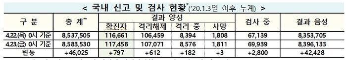 ▲ 23일 0시 기준 코로나19 국내 신고 및 검사 현황. [출처= 중앙방역대책본부] |