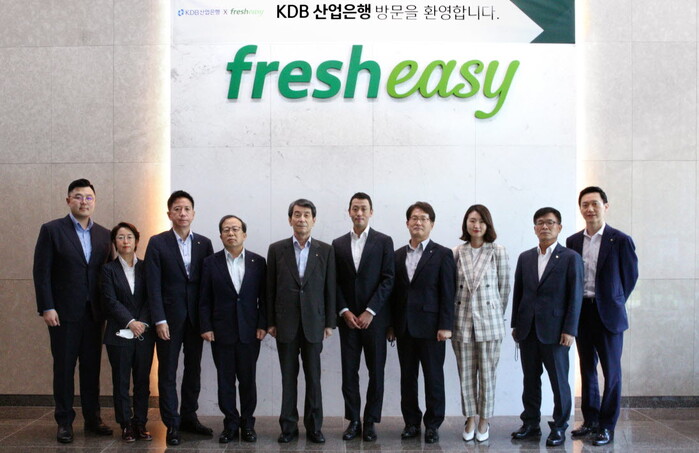 ▲ 동걸(왼쪽서 다섯 번째) 산업은행 회장은 첫 번째 임기 마지막 날인 10일 국내 1위 밀키트(Meal Kit) 기업 ㈜프레시지 용인공장을 찾아 코로나19로 잠시 멈췄던 혁신기업 현장 방문 행보를 이어갔다. [사진= 산업은행 제공] |