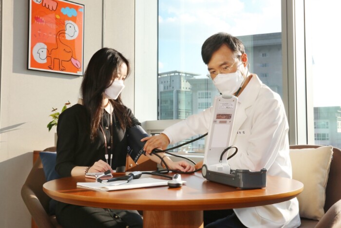 | ▲ KB국민은행 여의도 신관에 위치한 건강전략센터에서 김동진(가정의학과 전문의) 원장이 방문한 직원의 건강상담을 하고 있다. [사진=KB국민은행 제공] |