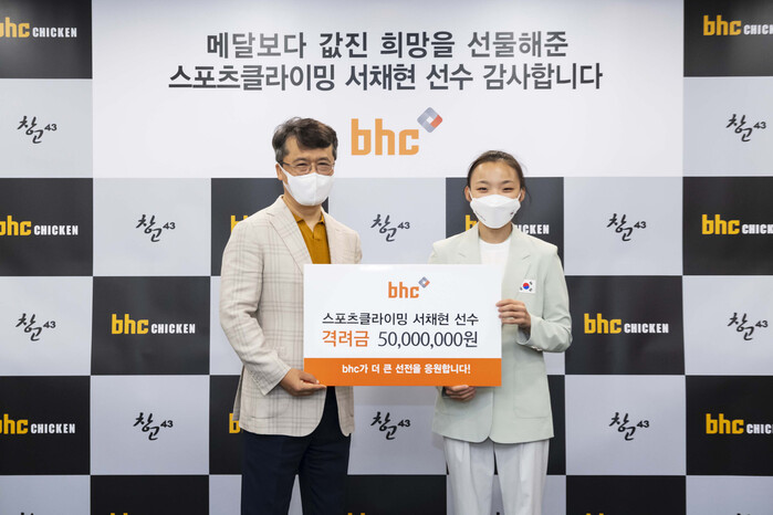 bhc치킨이 도쿄올림픽에서 큰 활약을 보인 스포츠클라이밍 국가대표 서채현 선수에게 격려금 5000만원을 쾌척했다.