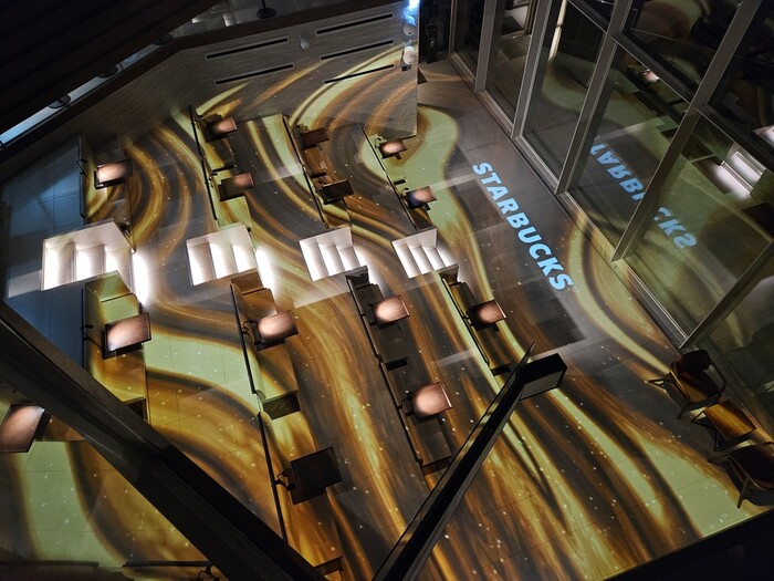 여느 매장과 달리 해당 매장에서는 해가 저물면 음악과 어우러진 커피를 표현한 미디어 아트 프로그램을 감상할 수 있는데, 스타벅스는 지난 2일부터 NHN벅스가 운영하는 음악 큐레이션 브랜드 essential;(에센셜)과 손잡고 새로운 콘텐츠를 선보이고 있다.