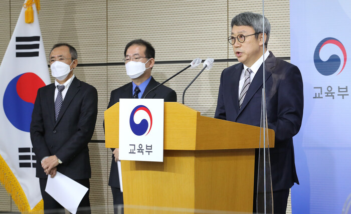 ▲ 위수민 출제위원장(한국교원대 교수)이 18일 오전 세종시 정부세종청사 교육부에서 2022학년도 대학수학능력시험 출제 방향을 브리핑하고 있다. 왼쪽부터 강태중 한국교육과정평가원장, 이문규 검토위원장(전북대 교수), 위수민 출제위원장. [세종=연합뉴스] |