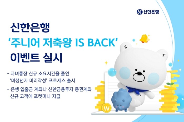 신한은행(은행장 진옥동)은 미성년자 통장 신규 소요시간을 획기적으로 줄인 ‘미성년자 미리작성’ 프로세스의 금융권 최초 출시에 맞춰 ‘주니어 저축왕 IS BACK’이벤트를 실시한다고 22일 밝혔다.