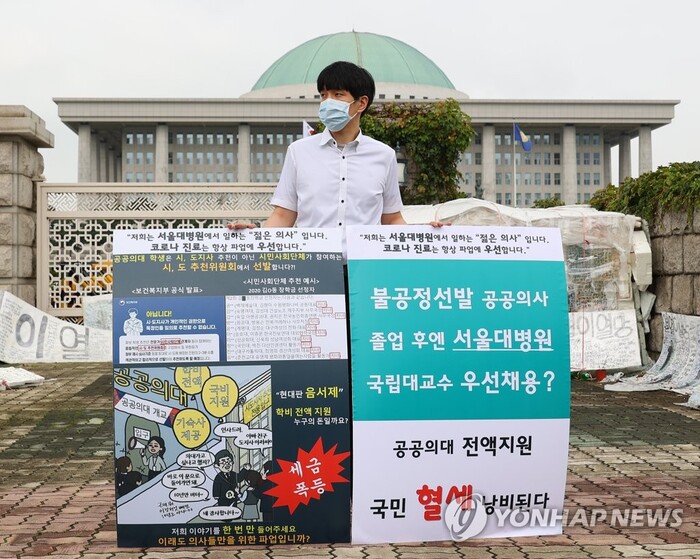 ▲ 서울 여의도 국회 앞에서 서울대학교 병원 소속 전공의가 정부 의료정책 반대 1인 시위를 하고 있다.[서울= 연합뉴스] |
