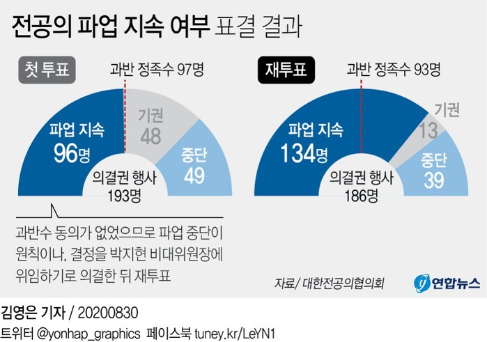 재투표 결과는 찬성 39, 반대 134, 기권 13으로 단체행동 중단에 대한 반대 의견이 과반 이상으로 우세했다.