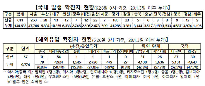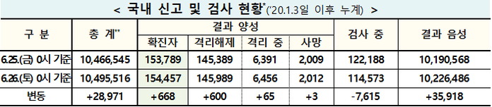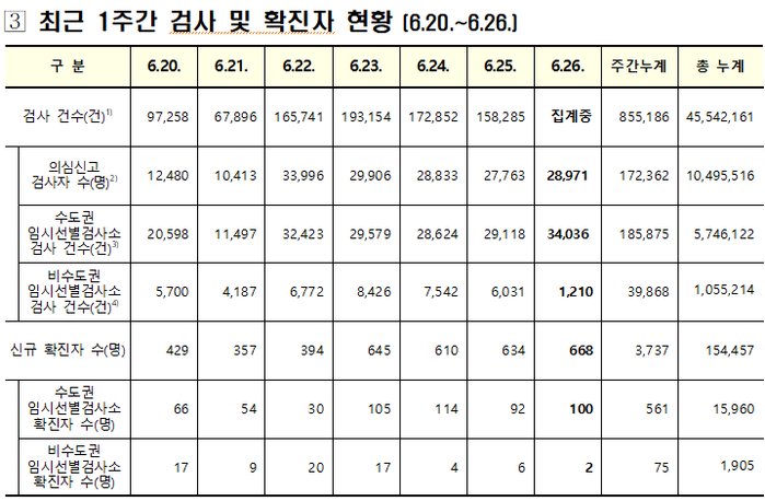 중앙방역대책본부는 26일 0시 기준으로 코로나19 신규 확진자가 668명 늘어 지금까지 누적 15만4457명(해외유입 9774명)으로 집계됐다고 밝혔다.