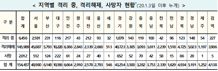 전날보다 3명이 더 목숨을 잃으면서 누적 사망자는 2012명이 됐다. 국내 평균 치명률은 1.30%다. 위중증 환자는 전날보다 6명이 많은 총 149명으로 집계됐다.