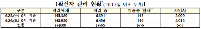 ▲ 26일 0시 기준 코로나19 확진자 관리 현황. [출처=중앙방역대책본부] |