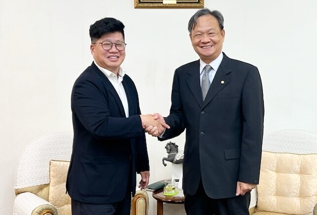 ▲ 에버그린 본사에서 강병구 CJ대한통운 글로벌 부문장(왼쪽)과 에릭 시에 에버그린 사장이 함께한 모습 [사진=CJ대한통운] |
